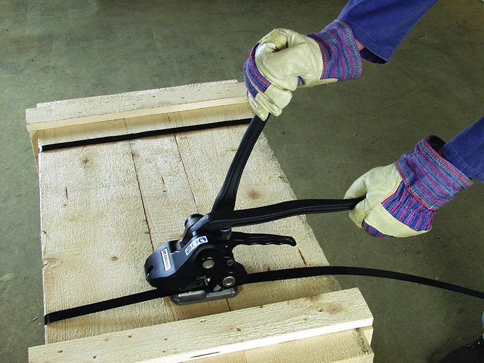 · 免用鐵扣,采用三點上下沖模咬合,利用上下沖模機構(gòu)將鋼帶打出三個陰陽扣互相咬合,抗斷裂強度可達85%,相較傳統(tǒng)鐵扣結(jié)合更加強韌。